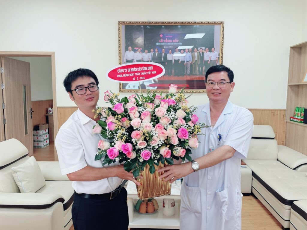 Công ty In Nhân dân Bình Định tặng hoa chúc mừng Ngày Thầy thuốc VN 27/02 cho BS CK II Phùng Long, Giám đốc Bệnh viện. Ảnh VA.