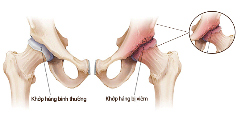 Viêm là kết quả của quá trình thoái hóa dẫn đến tổn thương, viêm nhiễm tại vị trí khớp vùng háng, gây ra các cơn đau đớn và khó chịu cho bệnh nhân. Cơn đau có thể ngày càng nặng hơn nếu không có sự can thiệp đúng và có thể lan rộng sang vùng mông, thắt lưng, đùi và chân gây cảm giác tê, mỏi ở hai chân, khó khăn khi duỗi thẳng, có thể khiến khớp bị cứng, chỏm xương biến dạng, gai xương thoái hóa sẽ mọc dài hơn, dẫn đến chèn ép và mất dần khả năng di chuyển.